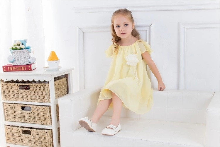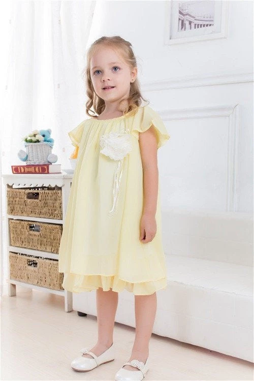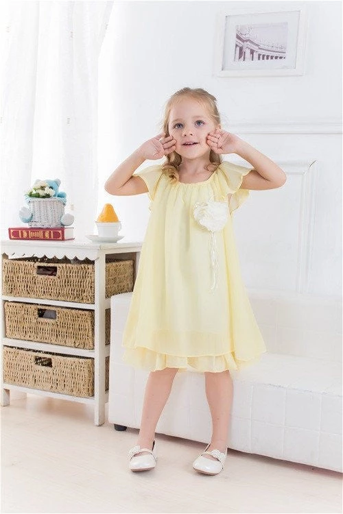 This elegant dress is made of soft, silky and light chiffon and has a gorgeous hand rolled flower under its neckline. This half sleeve dress looks simply adorable with its pleated double layered knee length skirt and a striking flower on the left with silky ribbons dangling loosely.The dress is perfect for summers and outdoor events and ensures super comfort to your delicate princess. The flower on the dress makes it a perfect choice for a flower girl appearance. The trendy styling and pleat details on the sleeves and hemline of the layers are too tempting to ignore Made in USA How to care:Dry clean or hand wash cold; do not bleach; hang dry Size:2yrs~12yrs **The Images reflect the actual product color**