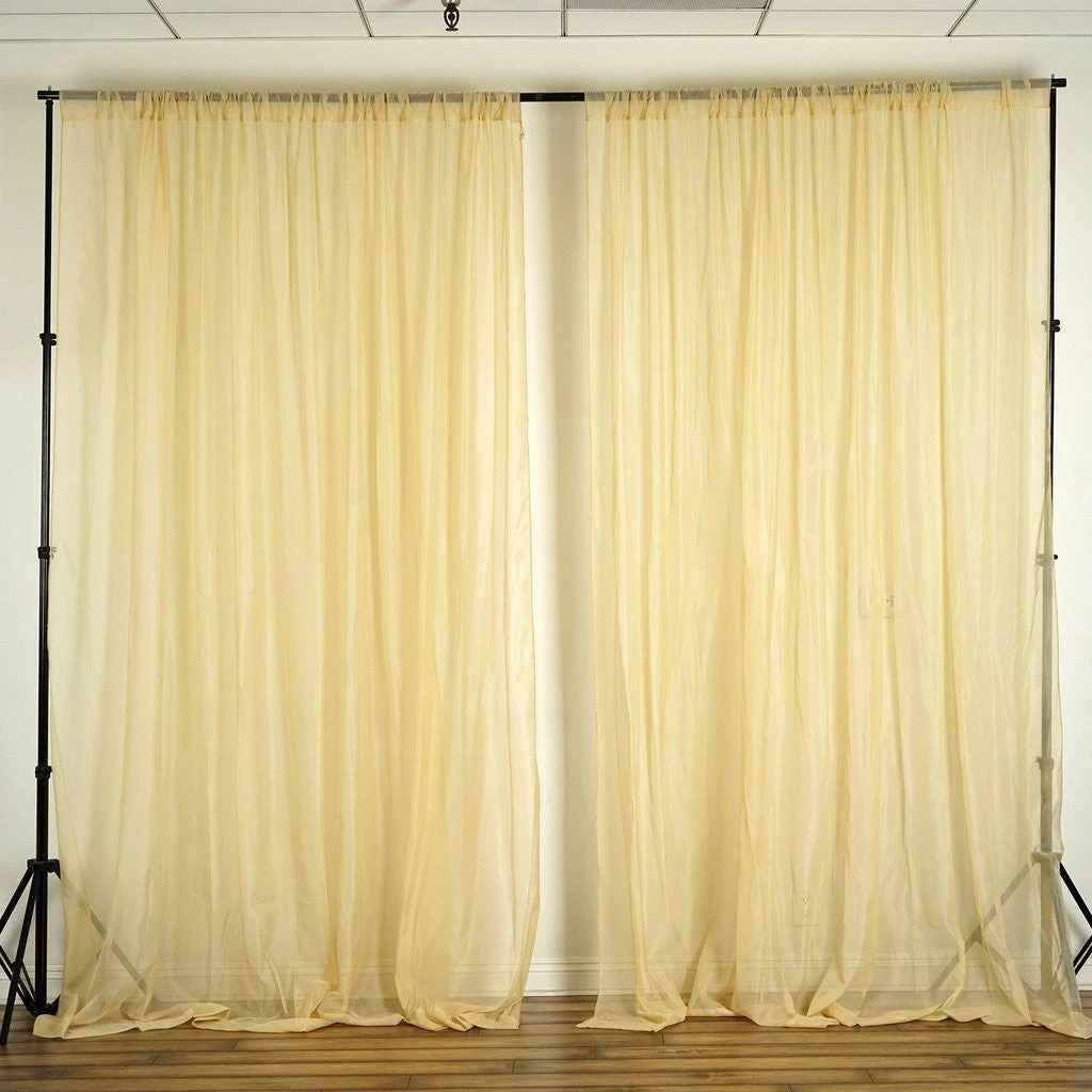Sheer, stylish, and extremely elegant; this sheer Voil curtain panel can be hung by itself to add charm to any place or can be coordinated with additional panels for a luxurious layered effect. Hang these delicate curtain panels from any standard size curtain rod and see how the flawless sheerness of soft Voil material coupled with lush cascading layers add an ethereal touch of elegance to your home or party space. These voguish Voil curtain panels offer airy ambiance and translucent beauty while softly filtering outside light and maintaining subtle secrecy. These gorgeous curtain panels create symmetrical balance with beautifully flowing layers of delicate Voil fabric that hang enchantingly to the floor. For a perfectly exotic feel, pull back the sides of the panels with ornate ascots or lovely ribbons, or add a stylish pelmet with dangling trims. These comely curtain panels make a perfect decorative accent for almost any room and any place that calls for an added touch of sophistication!