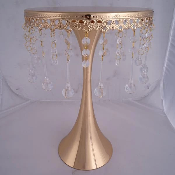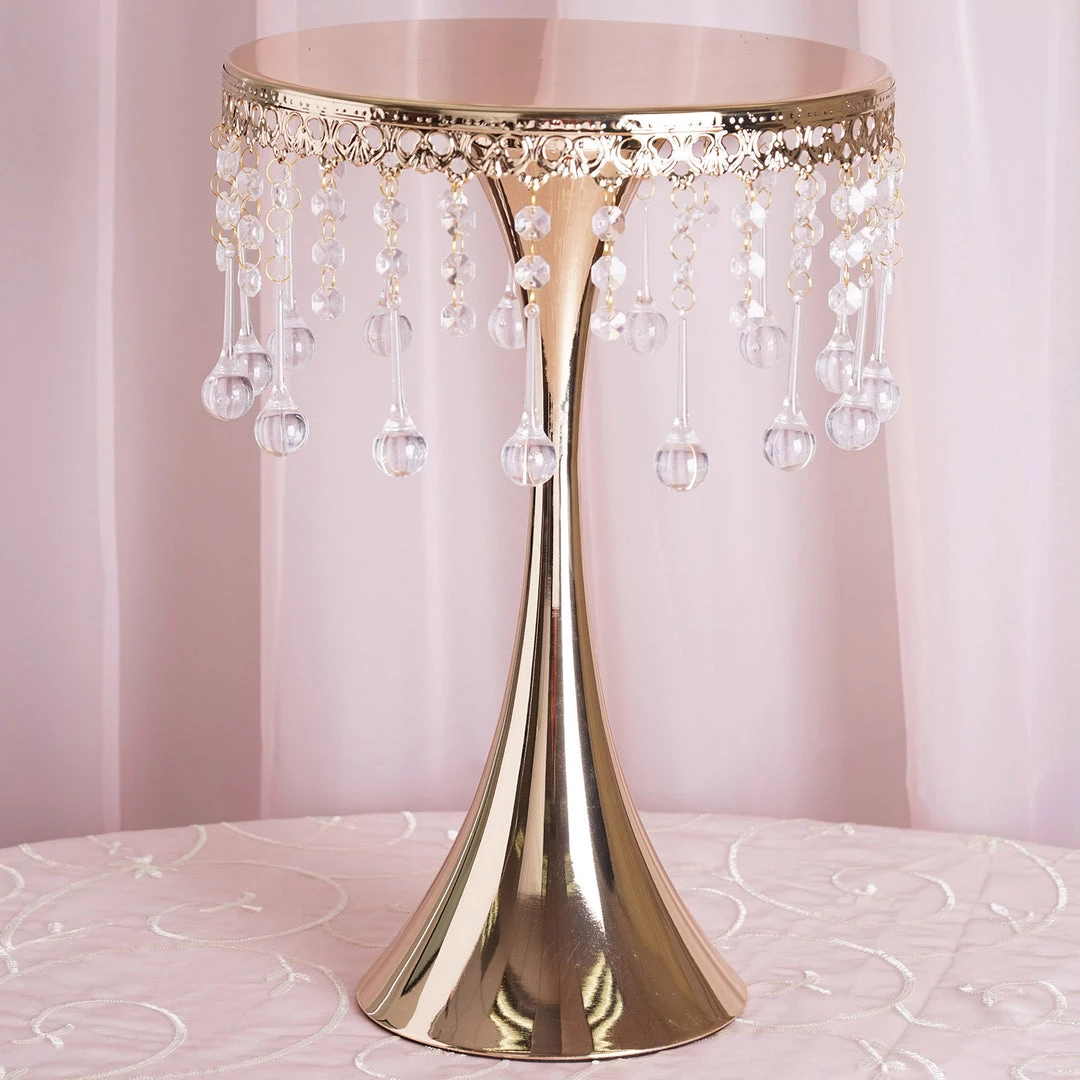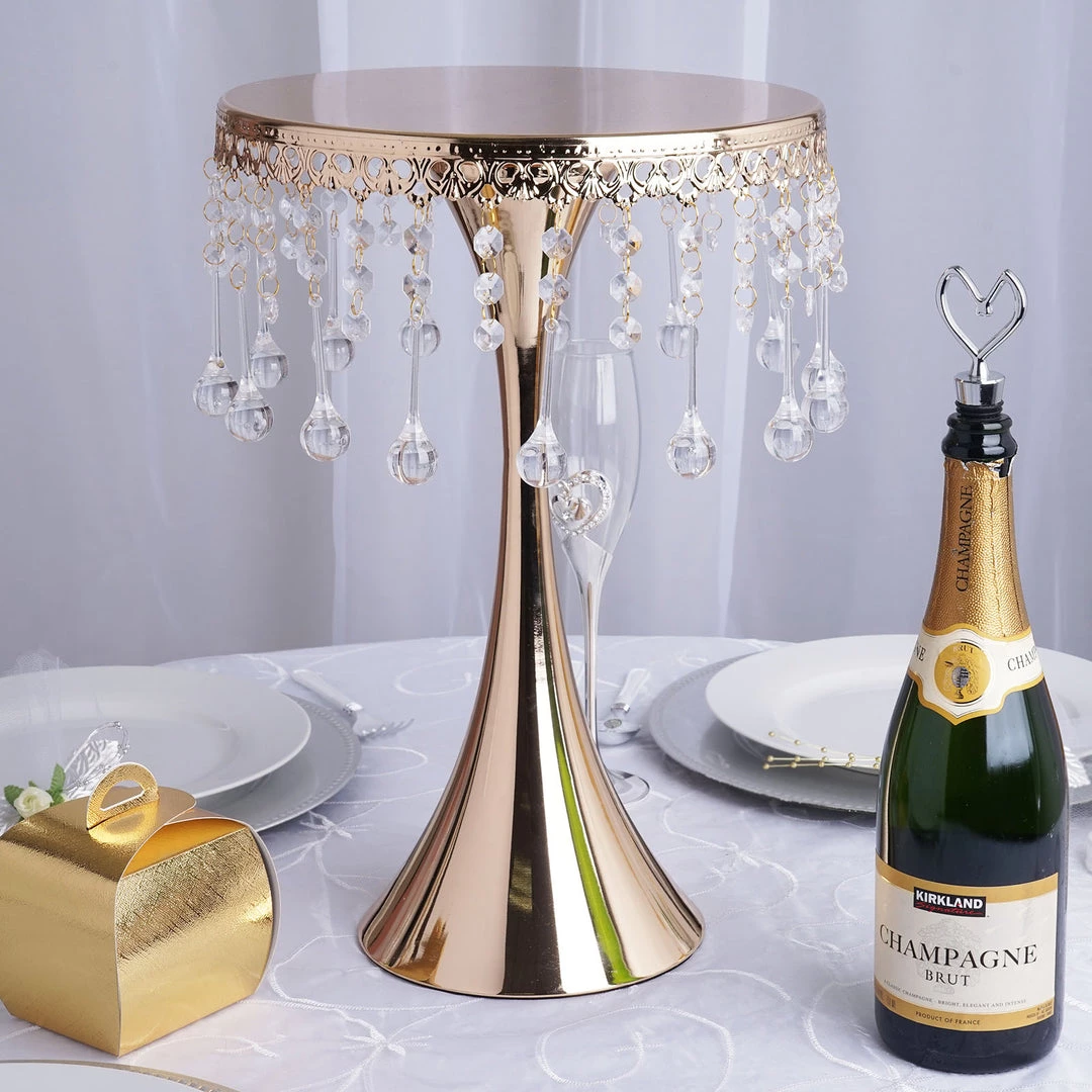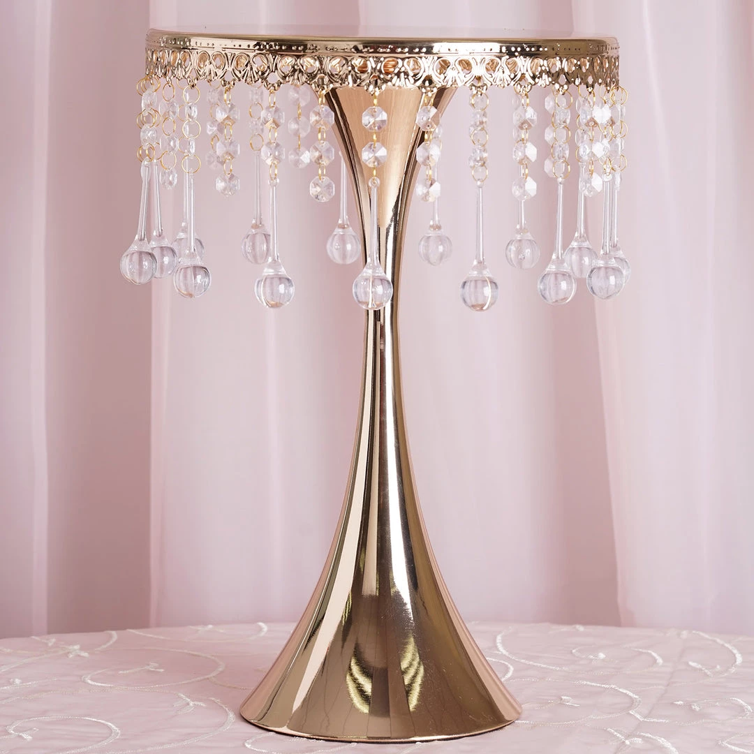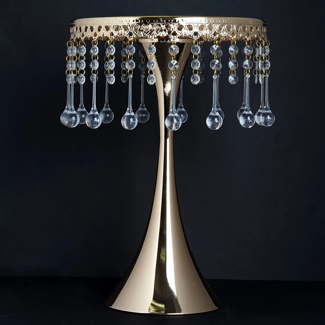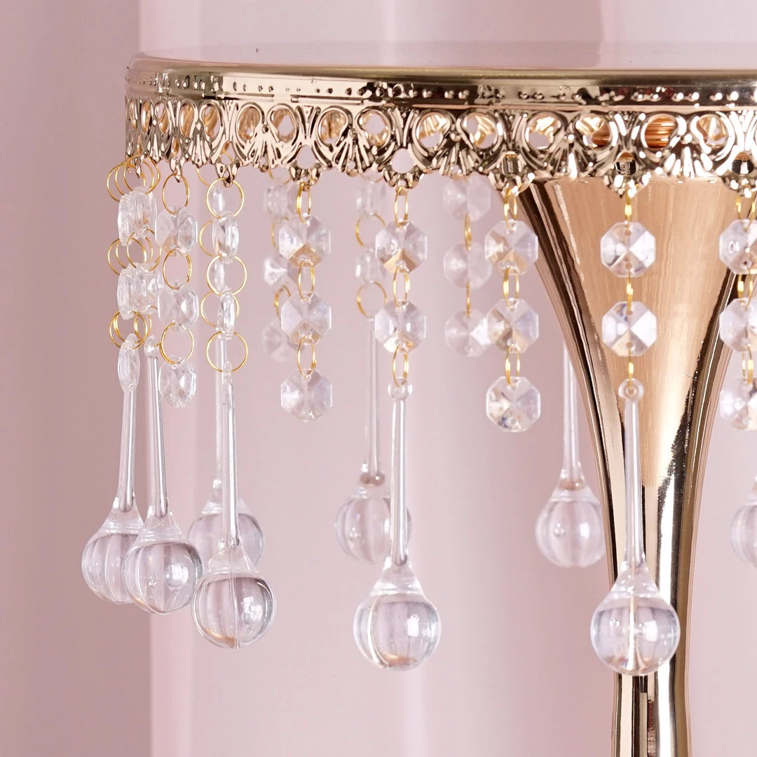 Showcase your fine delectable delicacies on this regal stand that is crafted with intricate artistry and brilliant craftsmanship. Soaring proudly, this glam stand makes an imperial cake or cupcake stand, as well as an elegant centerpiece riser. Quite a beauty it is, with those crystal clear acrylic pendants dangling mystically and sparkling metallic glint oozing enticingly! Seamless sheen and glistening luster of antique gold finishing give this ritzy stand a highly ornate look, which is attributed to the royal tableware. Bring that imperial appeal to your cake tables, dessert tables or guest tables by placing this tall, trendy metal chandelier stand atop. Shaped artistically like a trumpet with a sleek reflective top, scalloped in a breathtaking engraved design, and further titivated by 30 crystal hanging chains, this dazzling darling is quite classy and charismatic by itself!