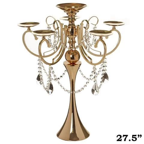 Add divine sheen and surreal sophistication to your candle display with this regal piece of pure opulence. This tall, bejeweled diamond crystal accented metallic candle holder is glamorous enough to cast a magic upon all the spectators with its romantic radiance and imperial design. Enticingly display lighted votive, candles, or tea lights with this mesmerizing candle stand, glamming up your wedding, banquet, or bridal tables. This sparkly bundle of divine shimmer is a lovely alternative to a plain candle holder, adorned with multitudes of crystal bead garlands and droplets dangling exotically, reflecting the light playfully and creating several dancing silhouettes as you light a votive, a tea light, or a candle in the holders. Place these in the center of your wedding table as a centerpiece, or atop your bedside tables of grand master bedrooms for an imperial touch of radiant luxury! An elegant way to enhance the visual appeal of any space, this stunning masterpiece is a must-have for those romantic dinners, wedding centerpiece decorations, or for vintage style events.
