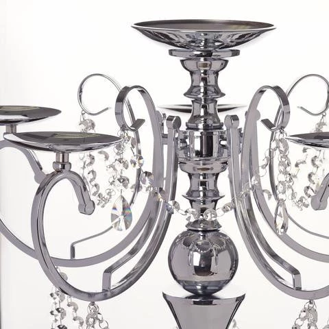 Add divine sheen and surreal sophistication to your candle display with this regal piece of pure opulence. This tall, bejeweled diamond crystal accented metallic candle holder is glamorous enough to cast a magic upon all the spectators with its romantic radiance and imperial design. Enticingly display lighted votive, candles, or tea lights with this mesmerizing candle stand, glamming up your wedding, banquet, or bridal tables. This sparkly bundle of divine shimmer is a lovely alternative to a plain candle holder, adorned with multitudes of crystal bead garlands and droplets dangling exotically, reflecting the light playfully and creating several dancing silhouettes as you light a votive, a tea light, or a candle in the holders. Place these in the center of your wedding table as a centerpiece, or atop your bedside tables of grand master bedrooms for an imperial touch of radiant luxury! An elegant way to enhance the visual appeal of any space, this stunning masterpiece is a must-have for those romantic dinners, wedding centerpiece decorations, or for vintage style events.