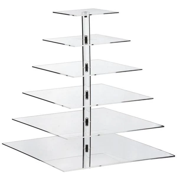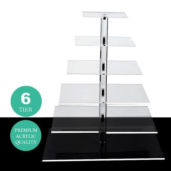 For an absolutely elegant and first-class display of your Wedding or Party Cake, use our multi-tiered clear acrylic cake stands. Exhibiting intricate craftsmanship and premium quality standard, this six tiered cake stand will add an imperial touch to your sweet treasures and delicious delicacies. Let your wedding cake be the center of attention and an eye-catching sight to behold with unique and sophisticated presentation. This highly durable crystal clear cake stand is modishly been fashioned using clear acrylic plates supported by sturdy center tubes that are made solid with metal screws to give high strength to the stand for supporting heavier items. The impeccable charm of clear acrylic coupled with the high durability of this stand makes it an ideal choice for professional bakers and confectionary parlors. For busy parties and outdoor events, this cake stand is highly suitable, strong breeze or accidental bumping will not wiggle or topple the stand due to heavy duty metal screwed solid center tubes. This cake stand will make all the eyes glued to your special wedding cake, with its seamless luster and peerless design. High quality crystal clear acrylic will not only impart a voguish charm to your cake or dessert tables, but will also heighten the scrumptiousness of your cake by creating a chic stylish display. To attain a totally exotic look and luxurious feel, surround the cake with LEDs, rose petals or votive candles, and see how glamorous the entire sight appears!