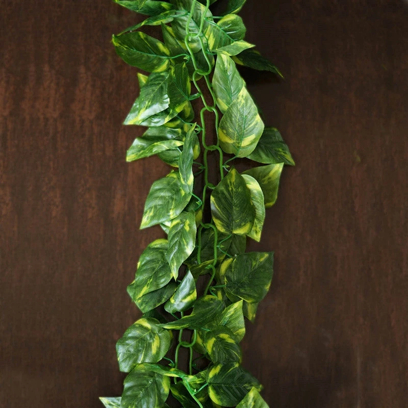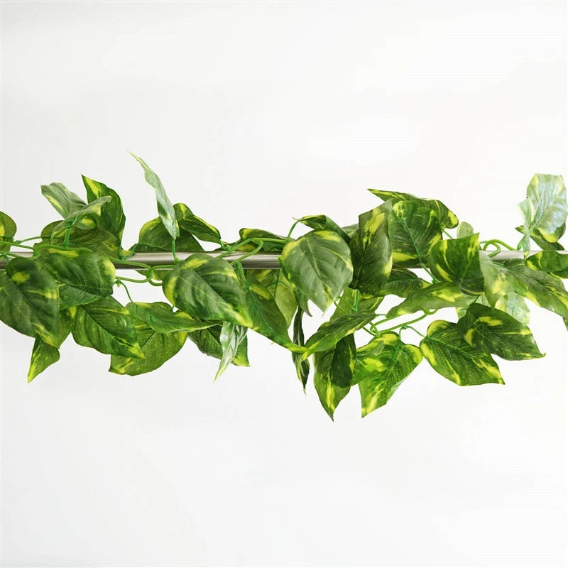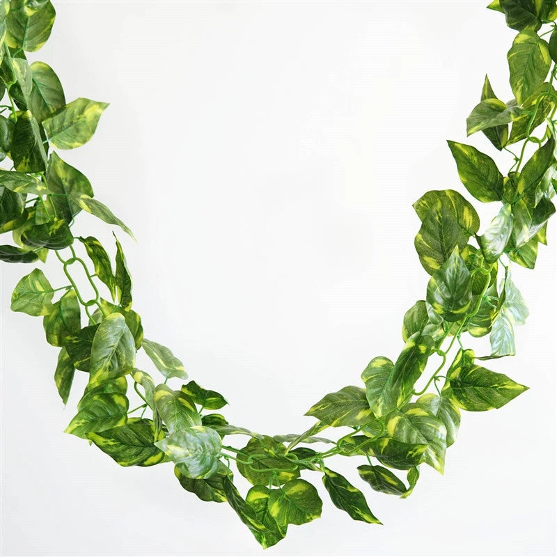If you need to bring some color to an otherwise plain banister, pole, or table set, we have a great selection of wedding supplies for you. Our Pothos Garland Chain is beautifully crafted to set the mood for a classic wedding or shower. This 8 foot long strand is perfectly and easily adjustable to fit your every need, and are can be changed by connecting or separating the hooks hidden from view. Each of the perfectly crafted Pothos leaves have a realistic look, complete with natural markings and color variations. Our pothos garland is easy to store and reusable, as it never wilts, and is crafted to last for years.