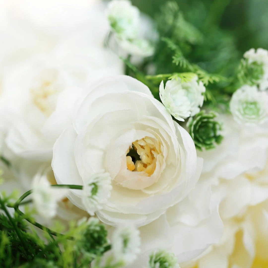 - Includes: Plastic greenery and approx 24-26 white plastic flowers