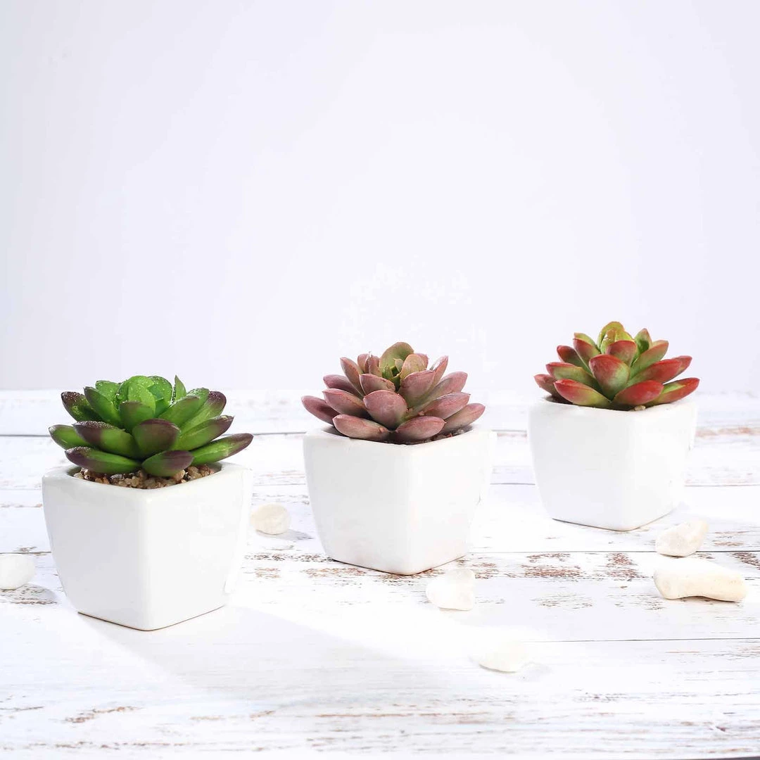 This set of 3 pots, containing artificial, but amazingly lifelike succulent plants is ideal for adding a dash of refreshingly modern style to your home, office, or party décor. Rustic round wood grain clay pots are pre-filled with decorative rocks and succulents to give you a truly classy decorative accent fit for any space and season. Bring the freshness of natural green to your life and space by placing these faux cacti pots in your living room coffee table, dining table, kitchen counter, bathroom shelf, home garden ledge, or hang from tree branches, arches, columns, and poles for an elegant rustic touch. Besides home and office decoration, our everlasting faux Succulents also make an ideal decorative accent for Rustic Parties, Woodland, Southwestern, and Garden-themed Weddings and Events.