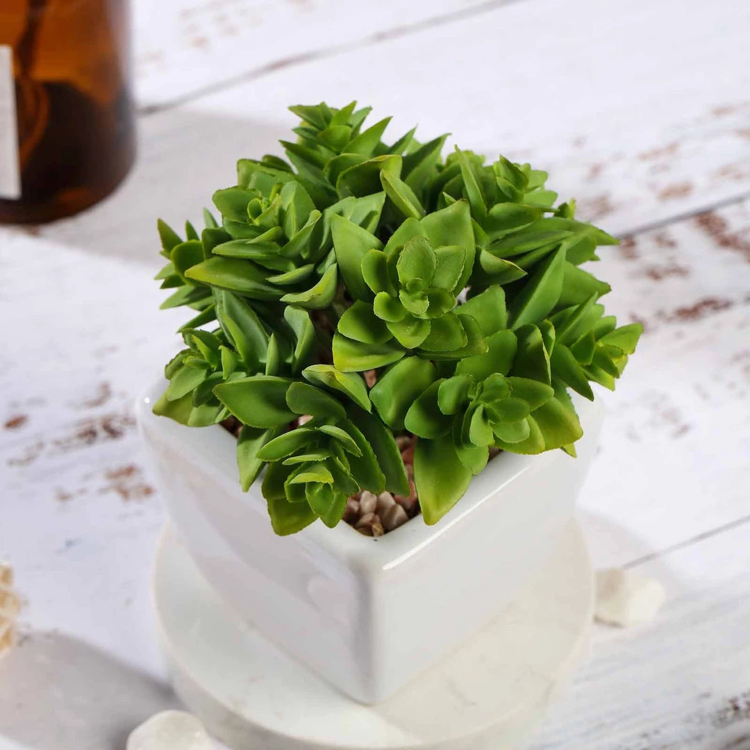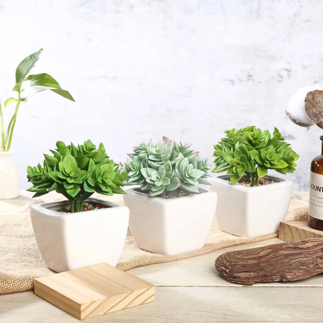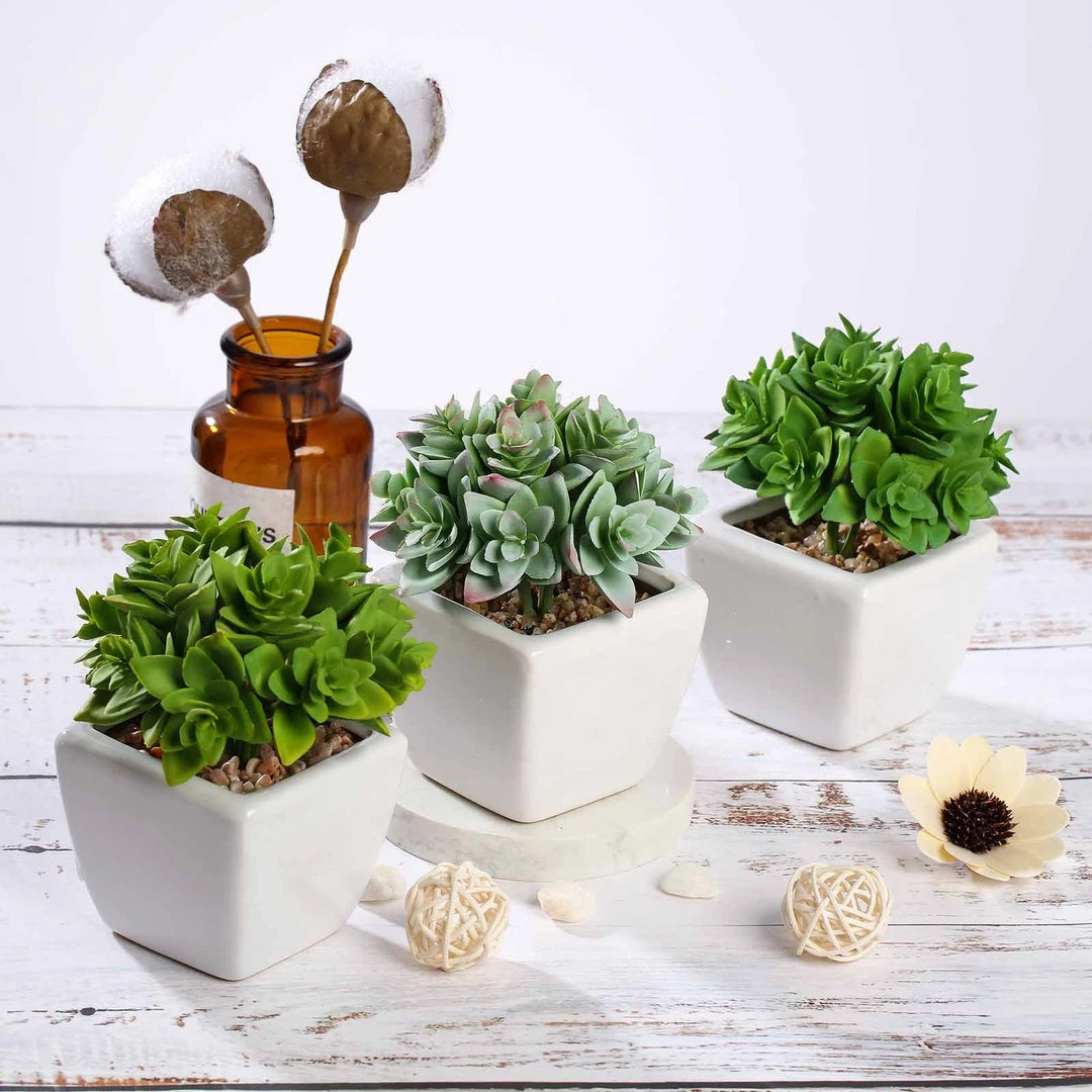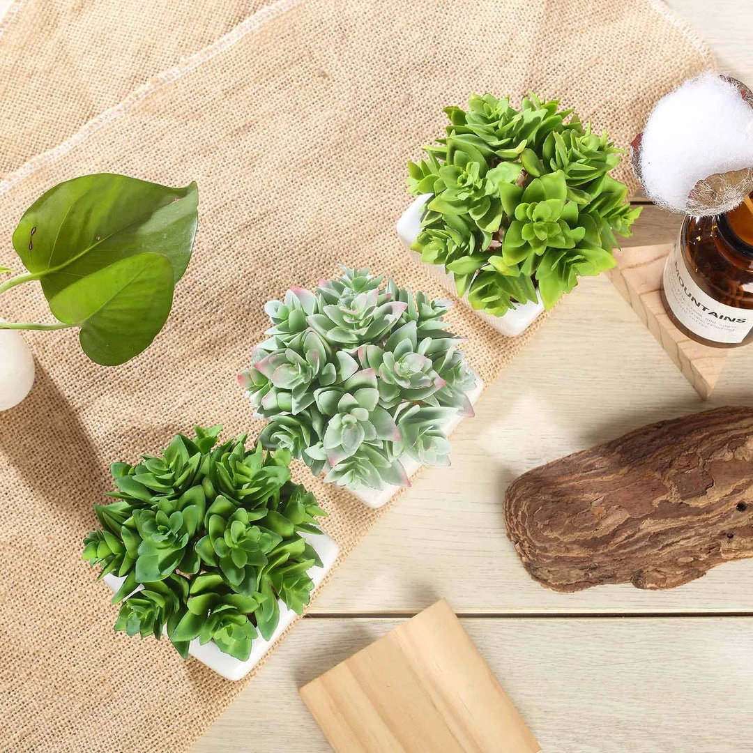 This set of 3 pots, containing artificial, but amazingly lifelike succulent plants is ideal for adding a dash of refreshingly modern style to your home, office, or party décor. Rustic round wood grain clay pots are pre-filled with decorative rocks and succulents to give you a truly classy decorative accent fit for any space and season. Bring the freshness of natural green to your life and space by placing these faux cacti pots in your living room coffee table, dining table, kitchen counter, bathroom shelf, home garden ledge, or hang from tree branches, arches, columns, and poles for an elegant rustic touch. Besides home and office decoration, our everlasting faux Succulents also make an ideal decorative accent for Rustic Parties, Woodland, Southwestern, and Garden-themed Weddings and Events.