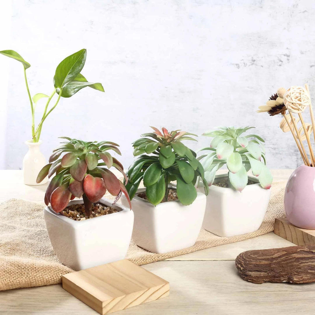 This set of 3 pots, containing artificial, but amazingly lifelike miniature succulent plants is ideal for adding a dash of refreshingly modern style to your home, office, or party decor. Cute ceramic pots are pre-filled with decorative rocks and succulents to give you a truly classy decorative accent fit for any space and season. Bring the freshness of natural green to your life and space by placing these faux cacti pots in your living room coffee table, dining table, kitchen counter, bathroom shelf, home garden ledge, or hang from tree branches, arches, columns, and poles for an elegant rustic touch. Besides home and office decoration, our everlasting faux Succulents also make an ideal decorative accent for Rustic Parties, Woodland, Southwestern, and Garden-themed Weddings and Events.