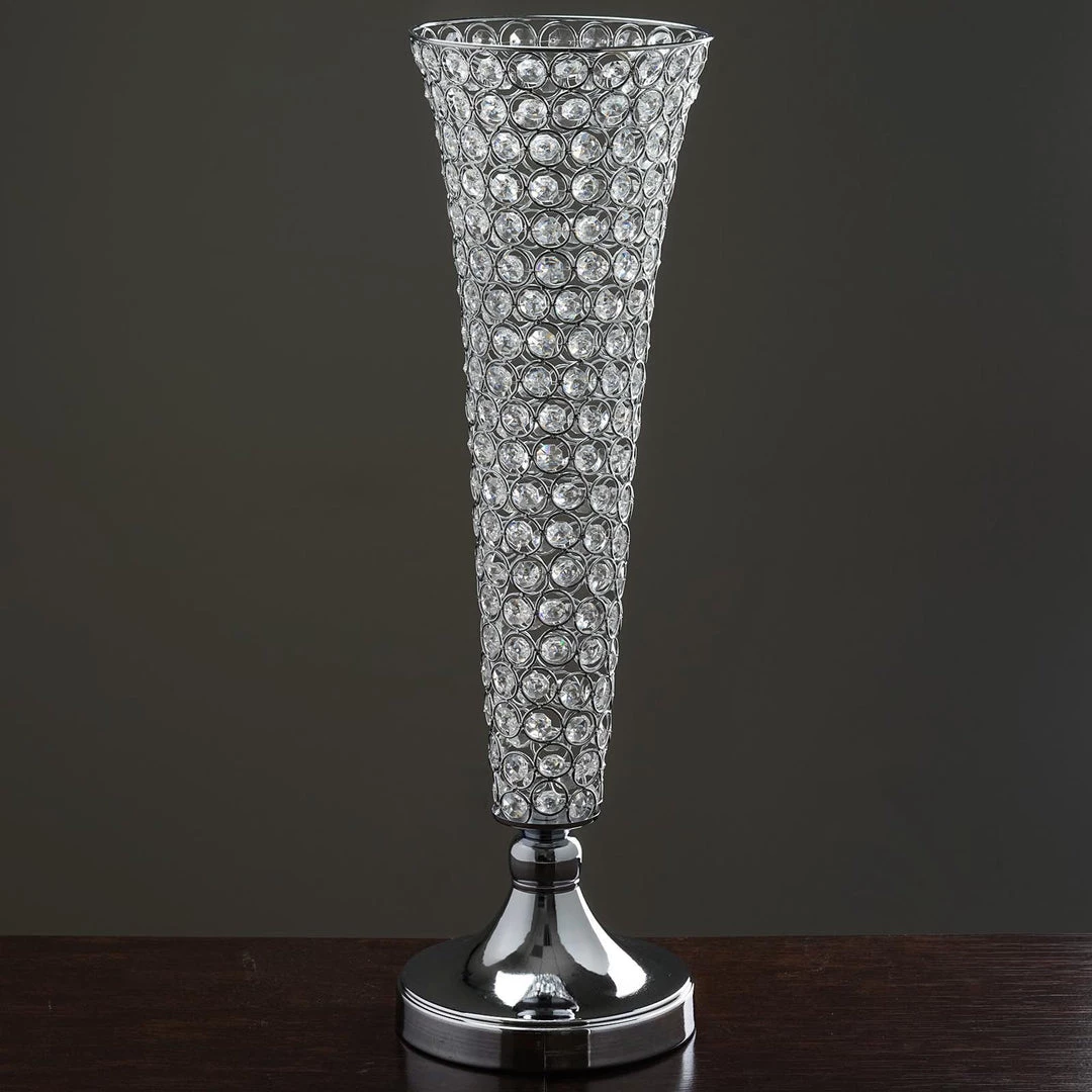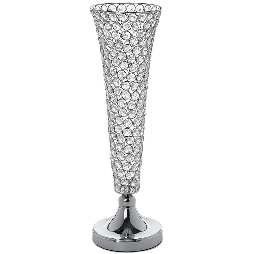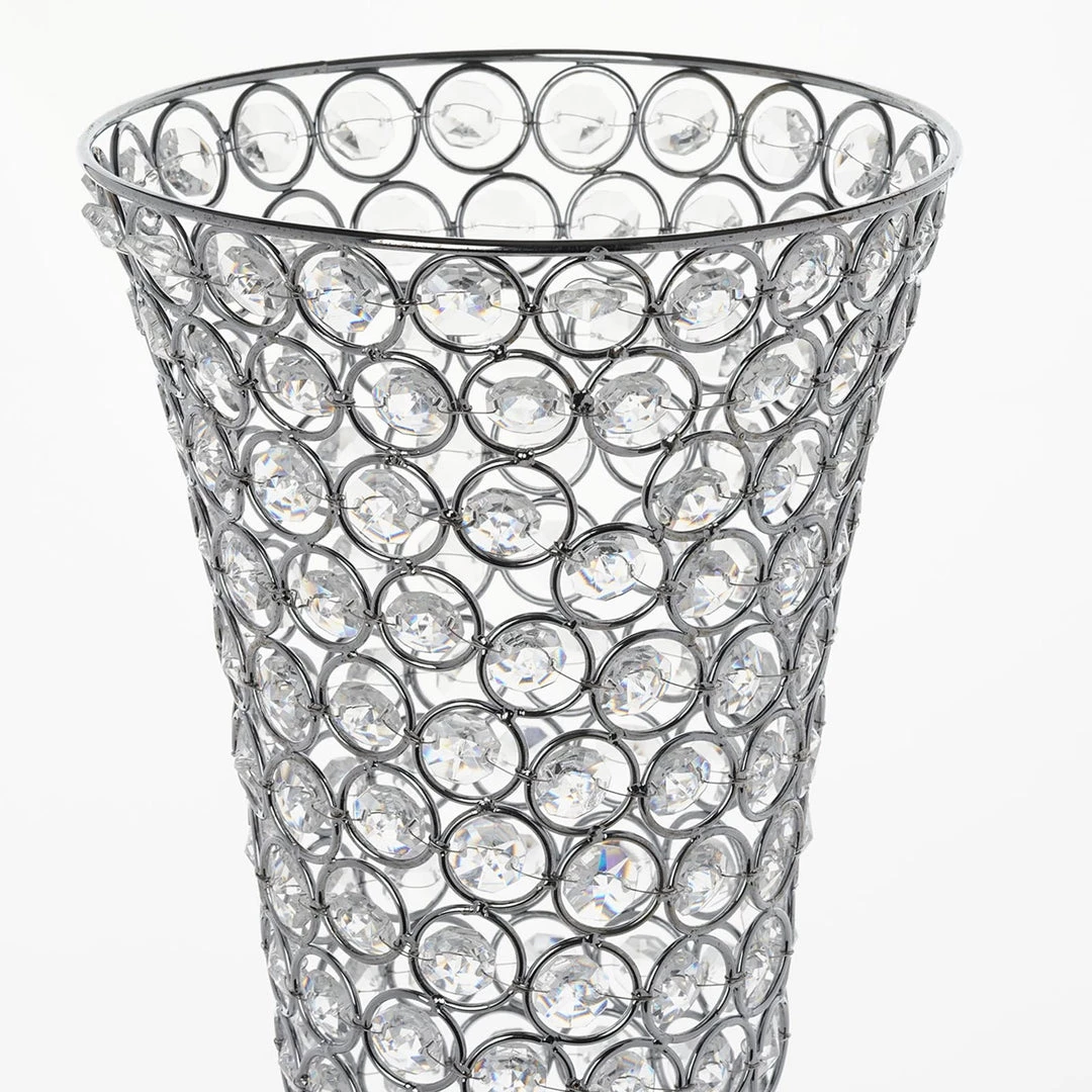 Beautifully fashioned in trendy lofty trumpet shape, this bedazzling beaded crystal vase features rows and rows of glinting beaded acrylic crystals in luxurious metal wire frame for a pure royal look and feel. Combining the surreal sheen of lustrous metal with sparkling magic of acrylic crystals, this glam vase stand will add a touch of imperial elegance into your wedding, party, or special event’s ambiance. Our dazzling jewel embedded vase is artistically crafted with faceted round acrylic crystals wired intricately in an elegant trumpet shape.